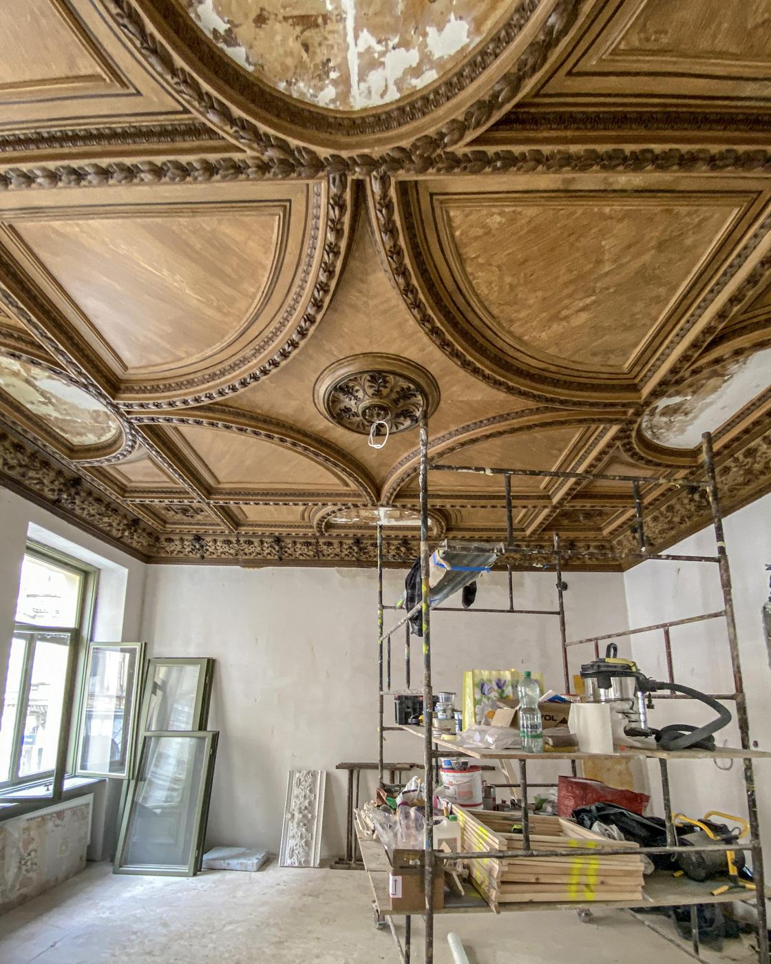 Przy Zielonej 6 sukcesywnie odrestaurowywane są polichromie i trwa montaż sztukaterii